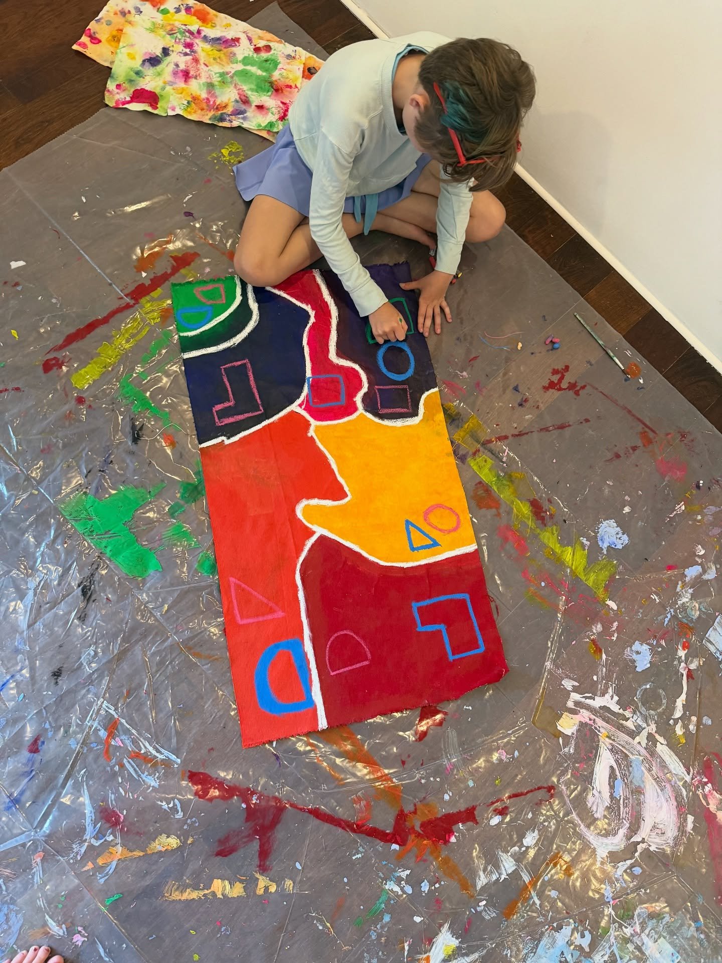 During camp, kids create large scale art inspired by their unique spirit. We explore how color, sound and movement are connected and can assist us in crafting unique pieces of art.